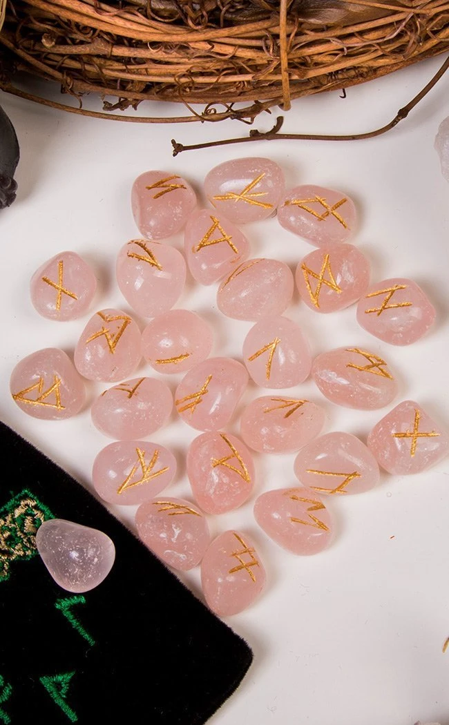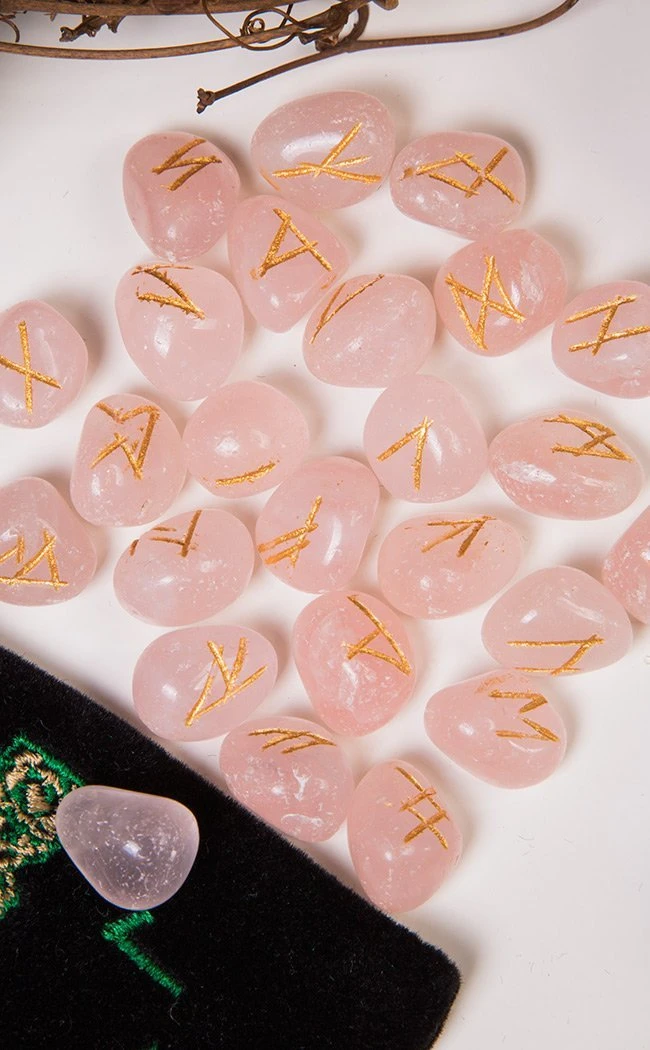 This authentic Rose Quartz Rune Stone Set is perfect for finding answers. The engraving on these stones are the ancient elder Futhark runes, which are the eldest known runic alphabet. This makes this set perfect for Wiccans and Pagans as each stone has magickal properties. Each set consists of 25 genuine Rose Quartz stones, each inscribed with a character from the Elder Futhark rune alphabet with one blank stone.Â