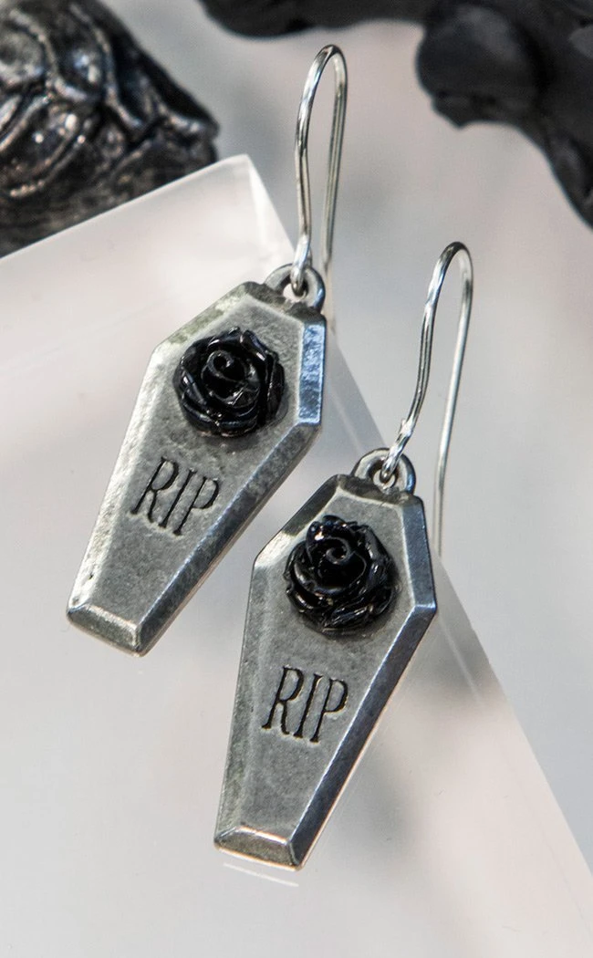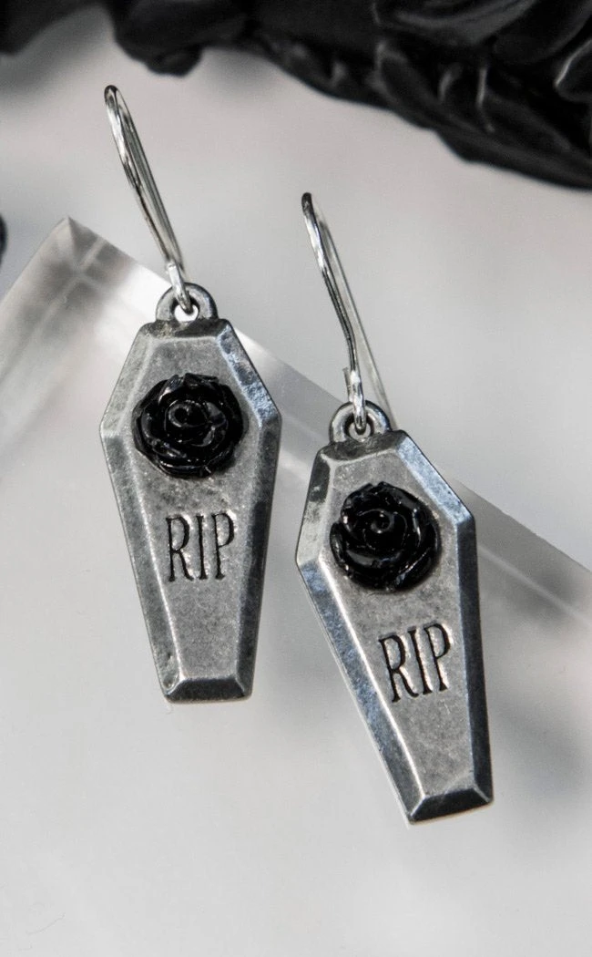 Send yourself off to the next life in style! These sweet little dangle earrings feature a black rose above the letters RIP. A small way to bring some subtle deathly glamour to any look.