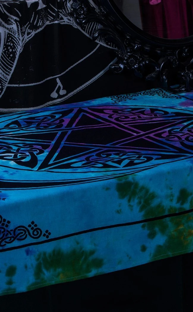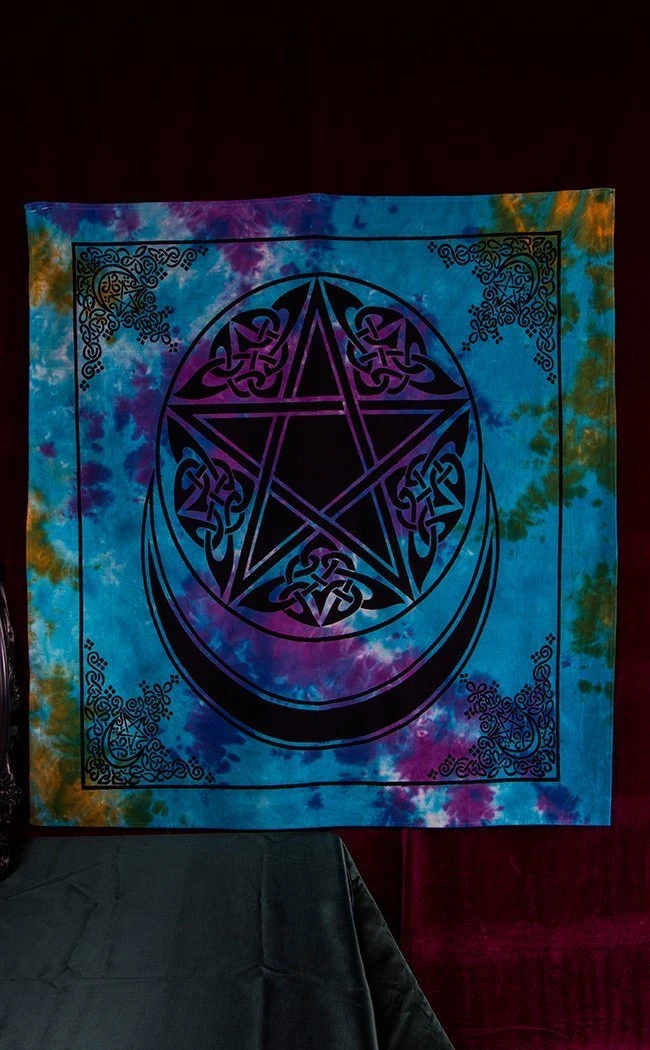 A gorgeously intricate pentacle and moon print on a tie dyed cloth. Perfect for use as an altar cloth or wall tapestry.