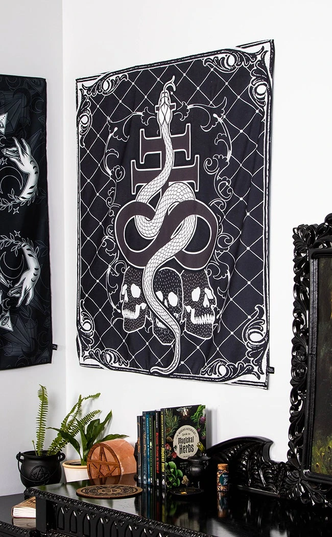 Worship your inner goddess with the Lilith Tapestry Throw! This gorgeous tapestry features a serpent coiling around the symbol of the Leviathan and sitting on a bed of skulls. Filigree borders and motifs add an extra fancy touch, because every chamber of hell should look its best!