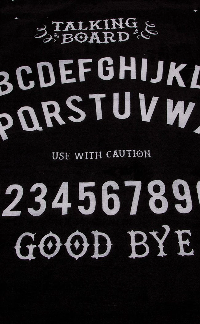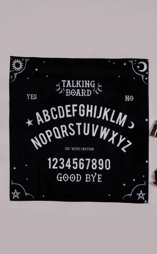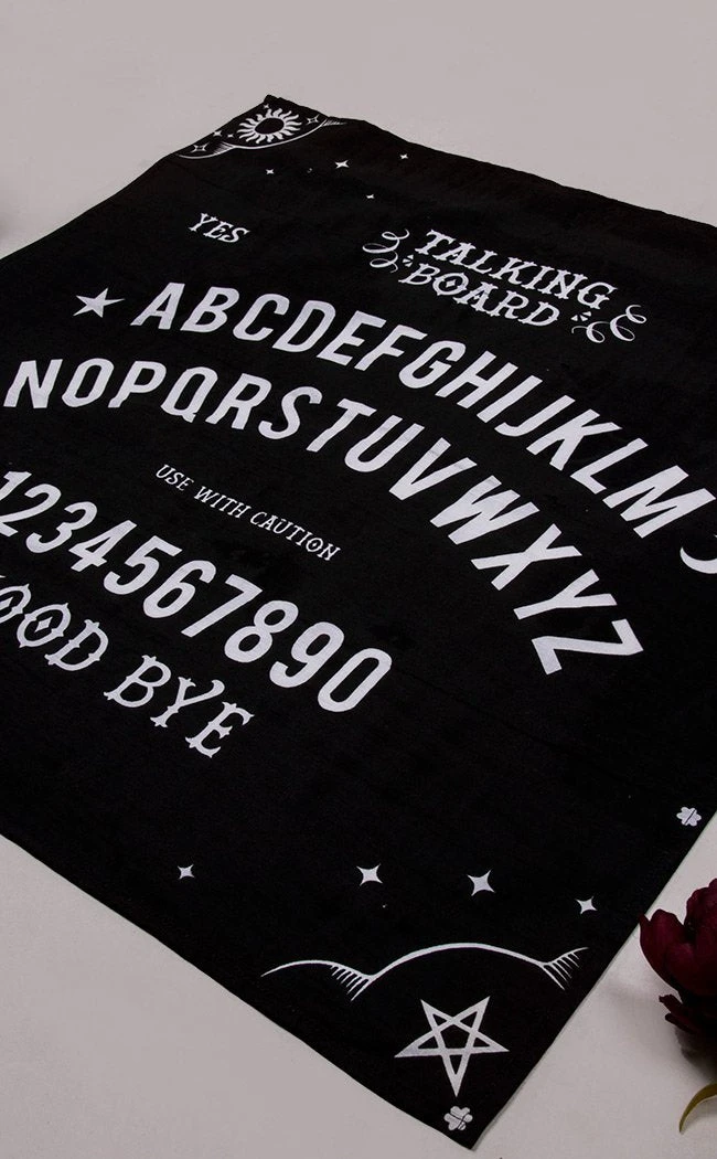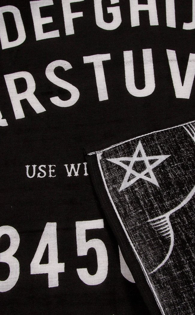 Printed as a full spirit board, this cotton altar cloth also features delicate art of the sun and moon as well as pentagrams in the corners along with stars peppered around the letters. Perfect for draping across your altar for display or protecting wood, or you could even hang it as a tapestry.