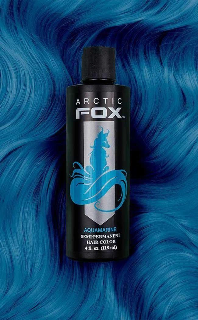 Aquamarine is a vivid aqua blue shade. If you have yellow undertones this colour will appear more turquoise. Arctic Fox Hair Color is cruelty-free, semi-permanent hair dye that is made only from vegan ingredients.Â