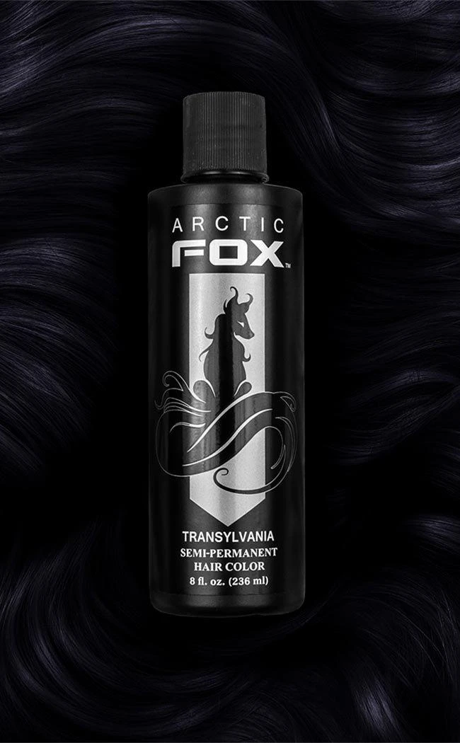 Transylvania is black with a blue undertone.  If diluted with Arctic Mist, you can create different levels of navy blue to blue-grey. Arctic Fox Hair Color is cruelty-free, semi-permanent hair dye that is made only from vegan ingredients.Â