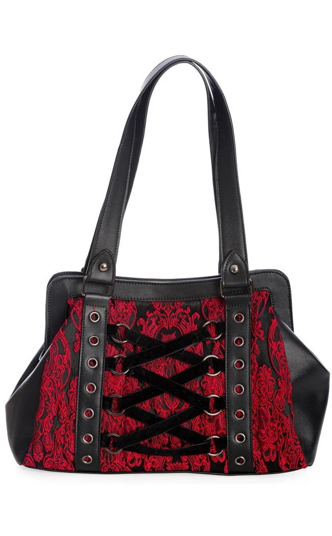 The Anemone Handbag is just what you need to add a lil morbid elegance to yer wardrobe. The front features bold red lace, faux leather eyelet straps and lace up details. The rear features a zip pocket for extra storage. The shoulder straps are the perfect length for daily use to bring dark Victorian vibes wherever you go!