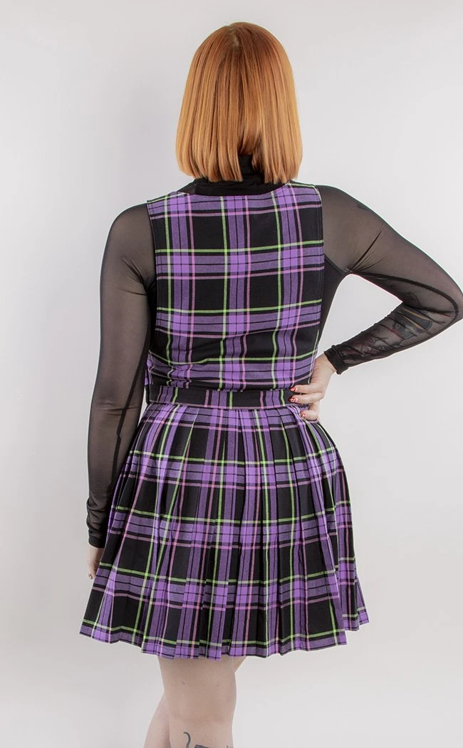 This tartan is a uniquely pastel purple and neon green pattern that takes centre stage. The bib buckles up with black metal trimmings at the shoulder, the pinafore closing with a side zip for easy on off. The skirt is pleated and has belt loops at the waist so you can accessorise to your mood.