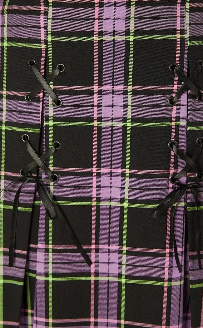 This tartan is a unique pastel purple and neon green pattern that takes centre stage. Flattering the bod with its high waisted fit, this mini skirt is decked out with corseting details and pleats at the front.