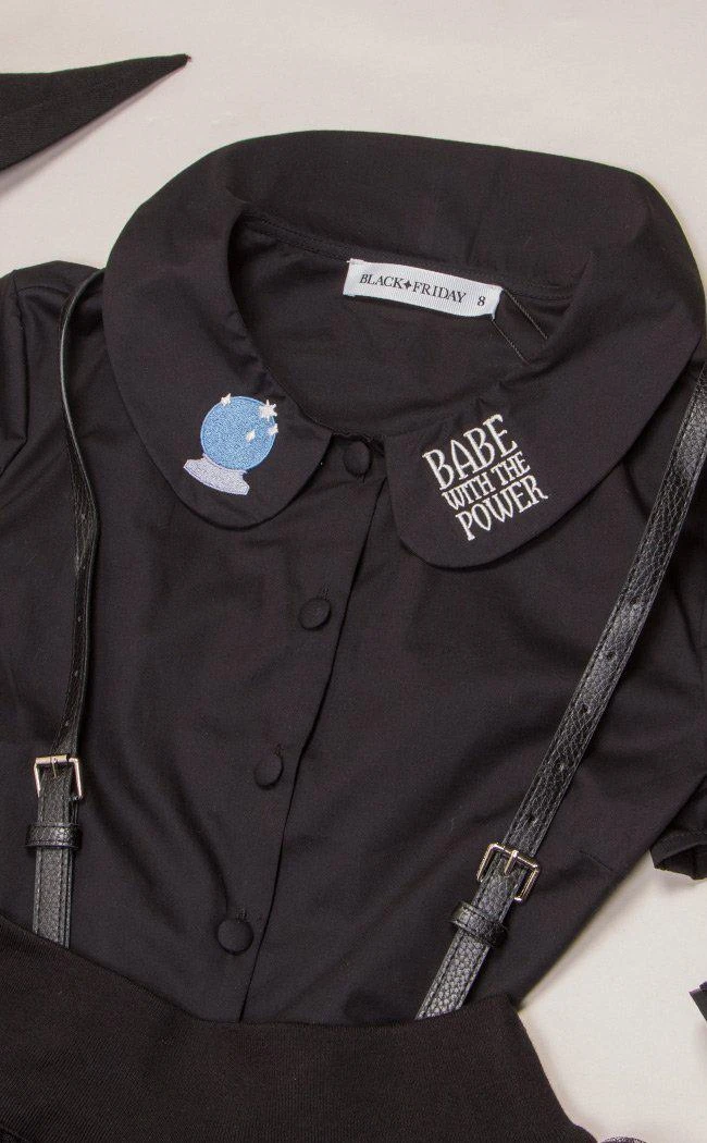 Dress up to the nines and watch as the world falls down.  This sweet blouse has a Peter Pan collar with an embroidered crystal ball and the phrase “Babe With The Power”.Â