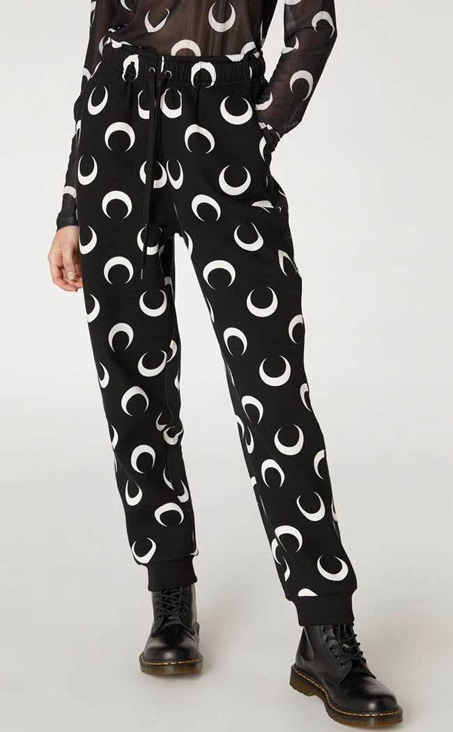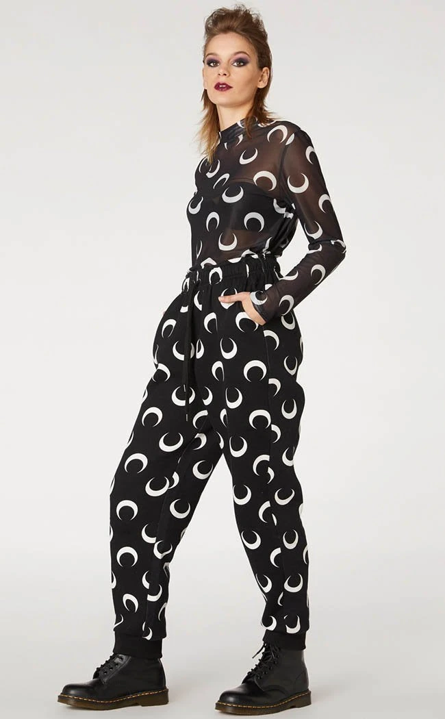 Let the night sky billow around you! These trakkies are super soft and warm, having a relaxed fit for that haute-slouch couture. Dozens of black moons sit against the pitch black fabric that ties at the waist and gathers at the ankles with ribbed cuffs.