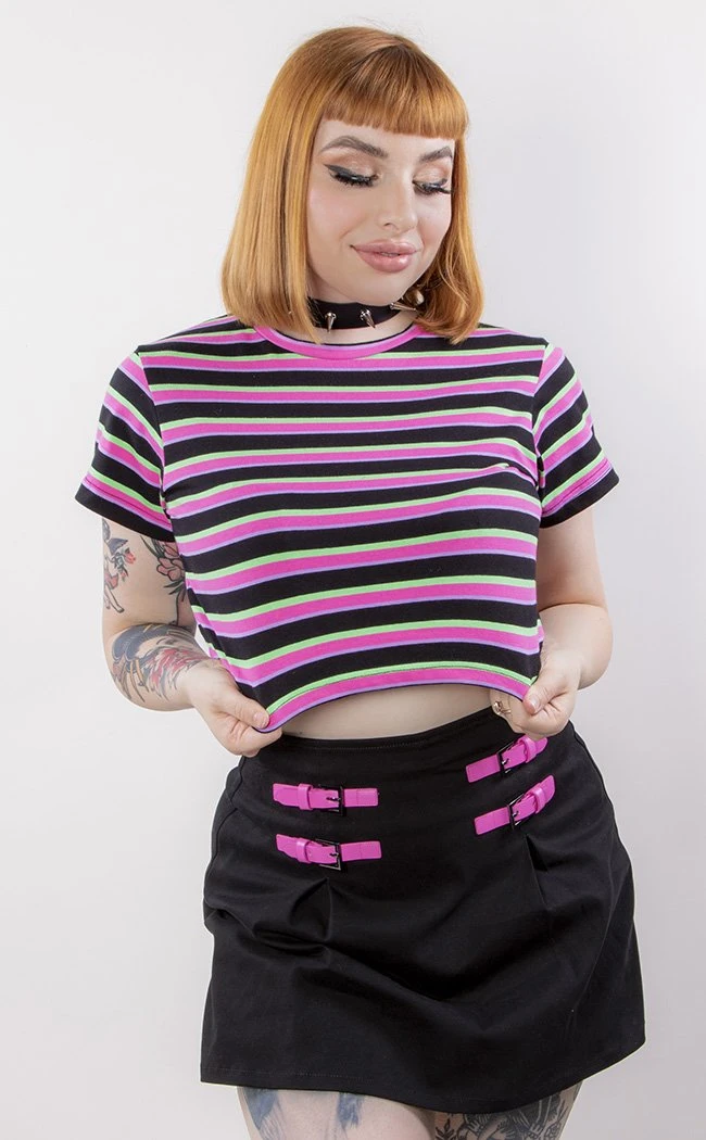 This wigglin’ skirt is made to hug yer bod, fitting with a wide band at the waist. Contrasting pink stitching creates flattering lines over the black body, accentuating the crafty cutouts at the front. With a rear zip fastening, this baby is easy to slip in and out of.Â