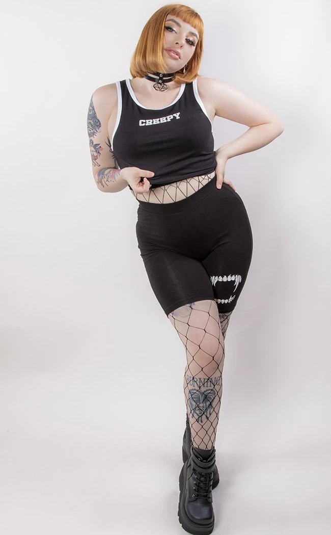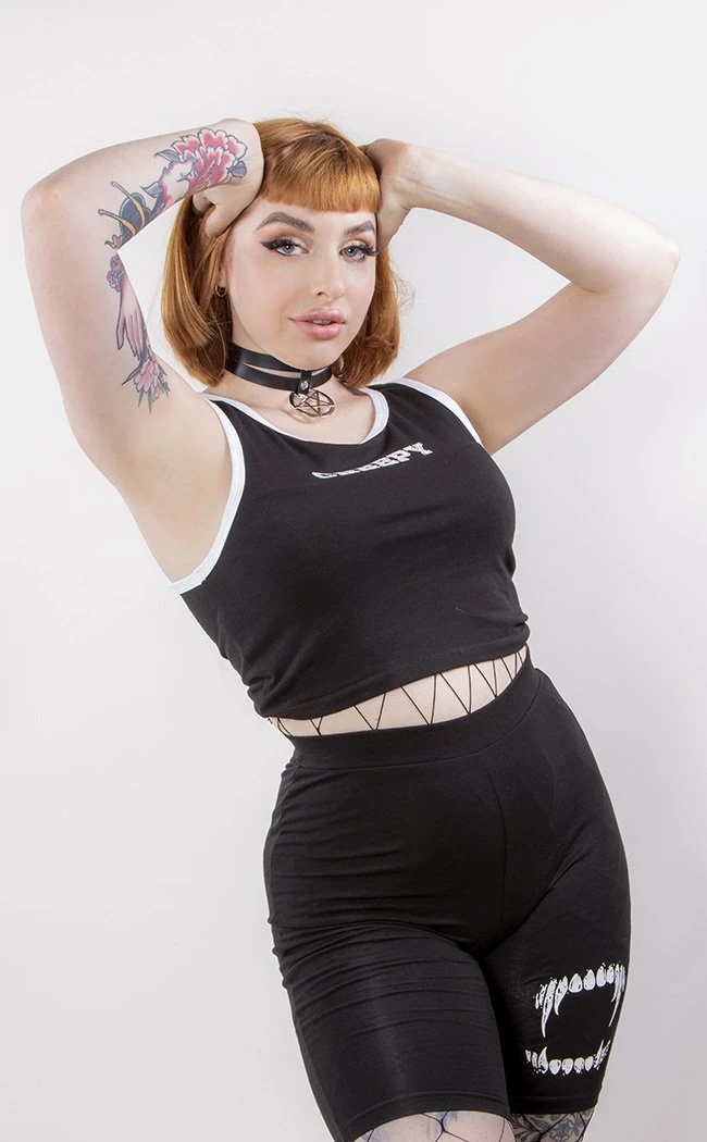 This little tank is super versatile with endless styling options! Cropped to the perfect length for high waisted bottoms, the shoulder straps and neckline are trimmed in contrasting white to match the “Creepy” print.Â