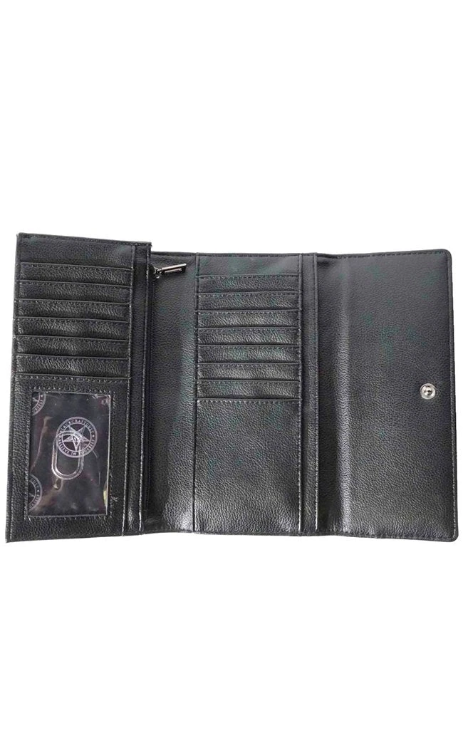 Go out for the night accompanied by one of her beloved creatures. This wallet has plenty of space for all of your cards and cash, with 14 card pockets including a windowed slot for ID. Suede and faux leather come together for a super wearable look.