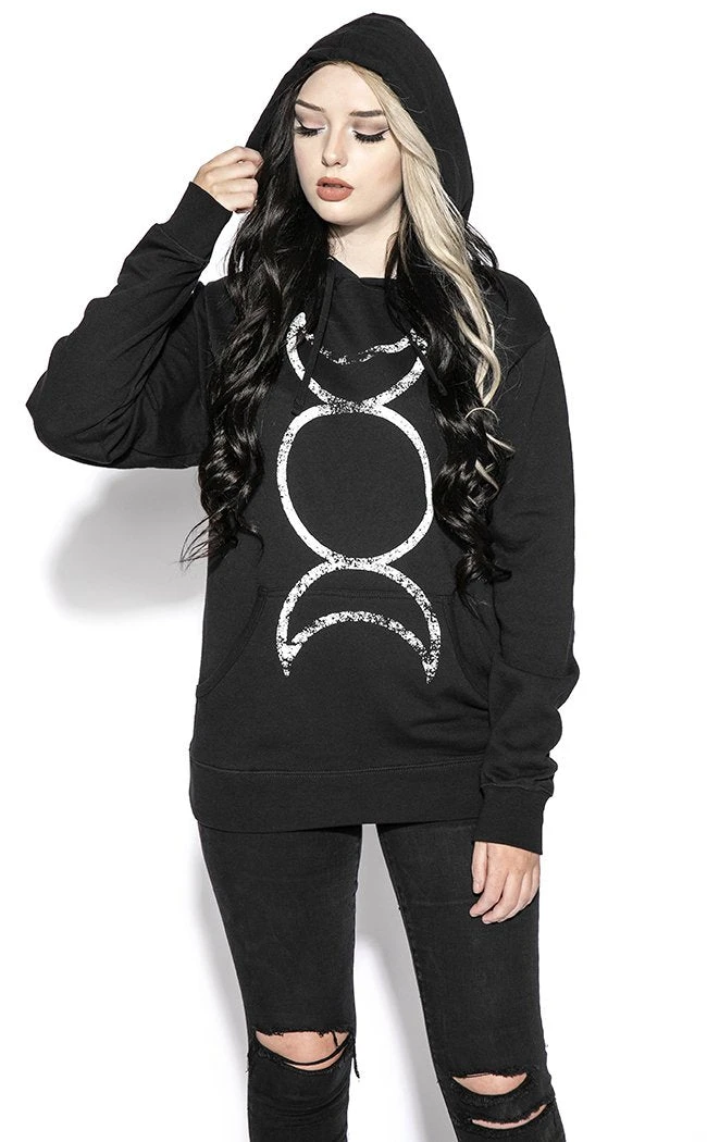 Warm yourself in the light of the goddess! This hooded sweater is super warm and cosy and printed with a vertical triple goddess symbol. It matches well with anything so you can wear it under the light of the moon or just while you need to snuggle up indoors.