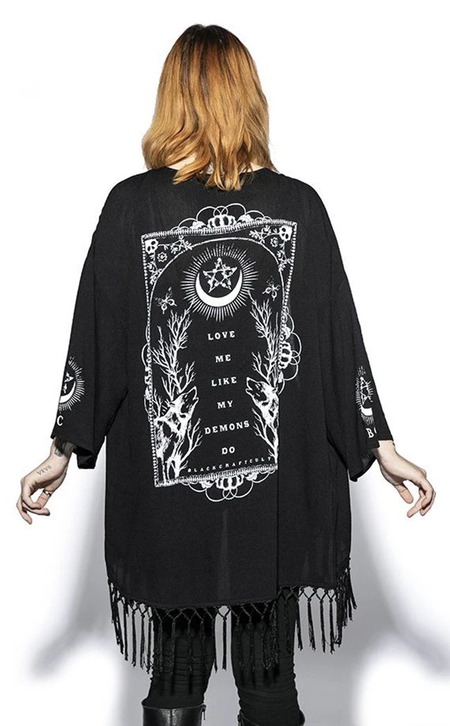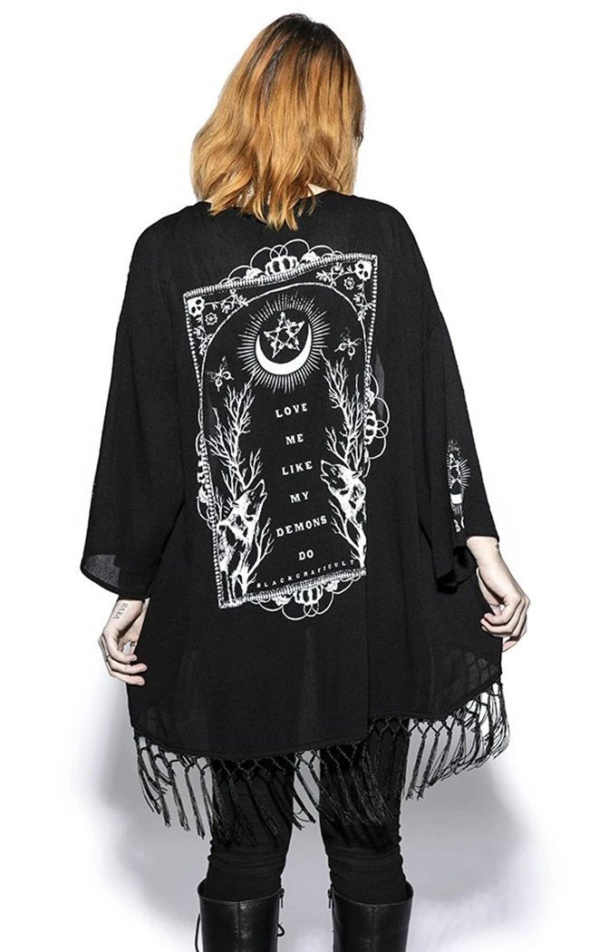 Get someone who loves you like a demon loves a tainted soul. This swishy kimono is a perfect beach coverup or the finishing touch to any outfit! An elegant print on the rear and crochet fringe bring some class to the halls of Hell.