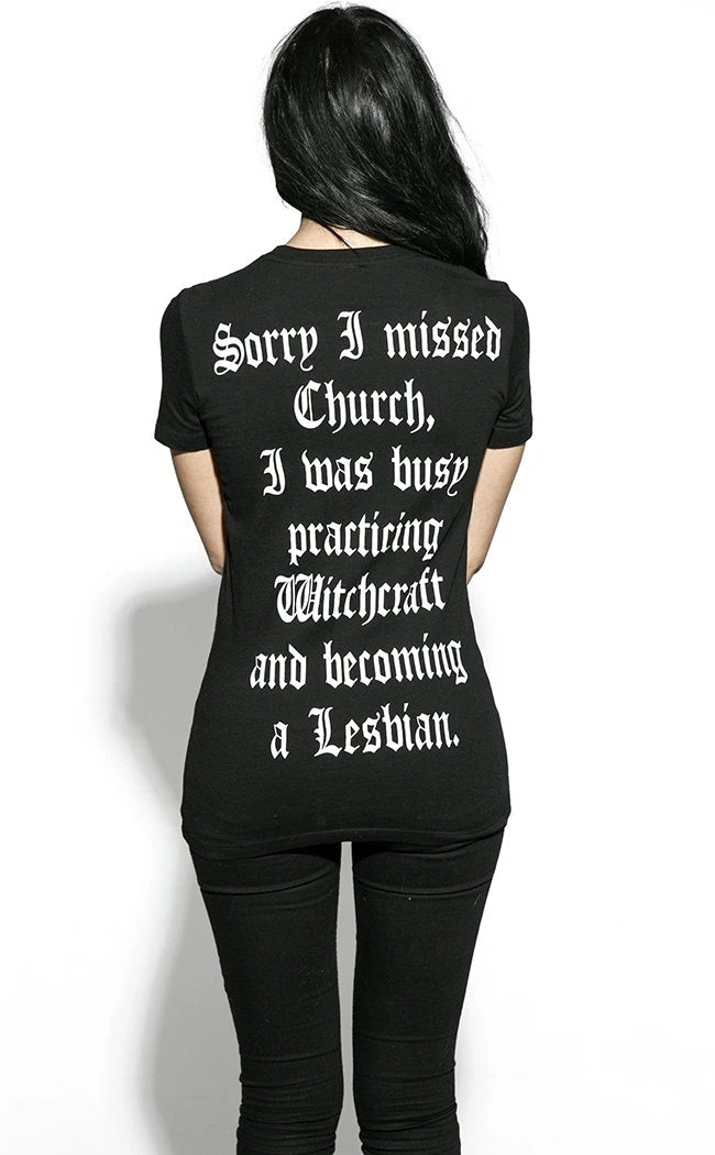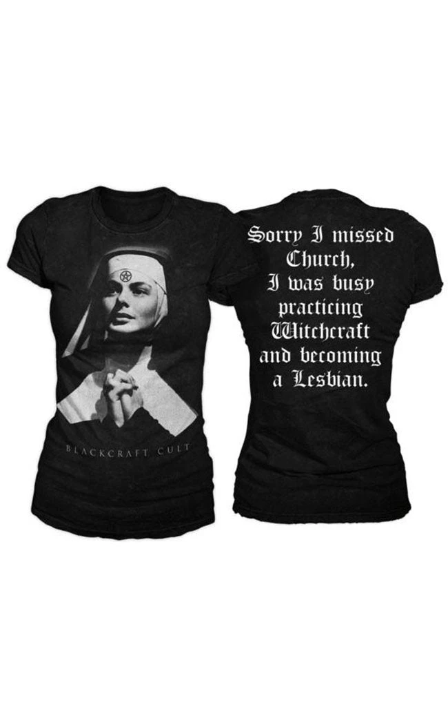 Get your priorities straight! This sinful tee features a pious nun of some unholy order at the front and the rear list threatens you with a really good time.