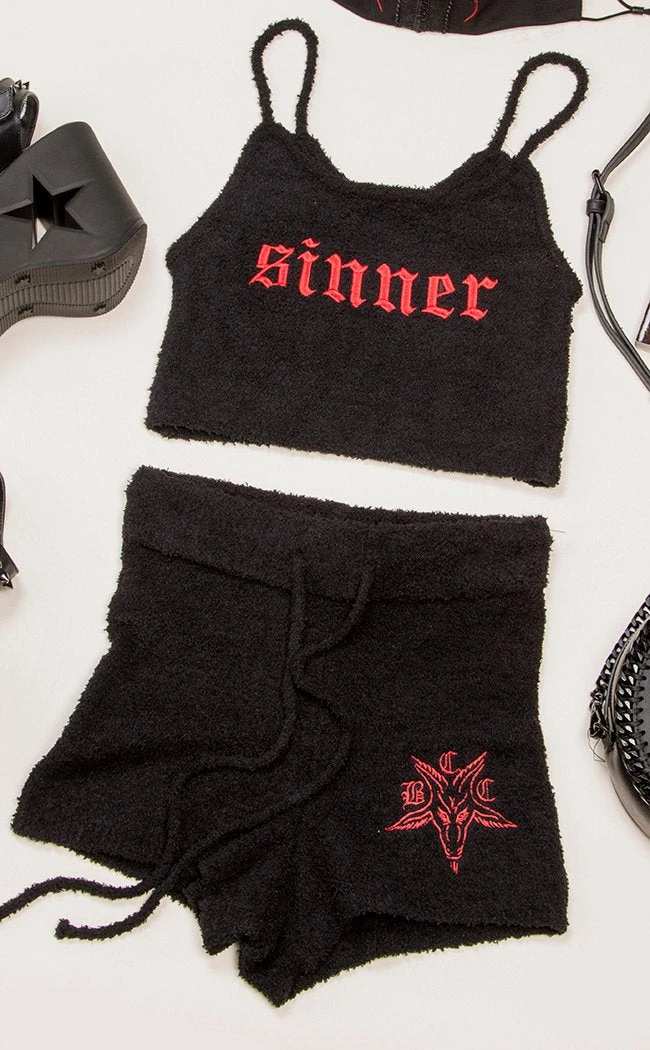 Get cute n cosy in these fluffy Sherpa pjs! This set includes a cropped cami with adjustable shoulder straps and a pair of drawstring shorts. The front of the cami is embroidered with “Sinner” in red. The shorts feature matching embroidery of the Blackcraft goat.