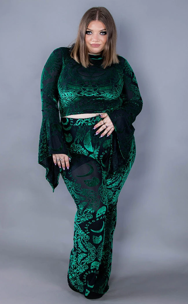 The Green Baroque Velvet Flares will have you lookin’ and feelin’ luxurious! Emerald green velvet forms a detailed baroque pattern, the pants fitting snug on the thighs and flaring generously at the knees. The pants come with built-in black modesty shorts as the pattern is somewhat see-through.