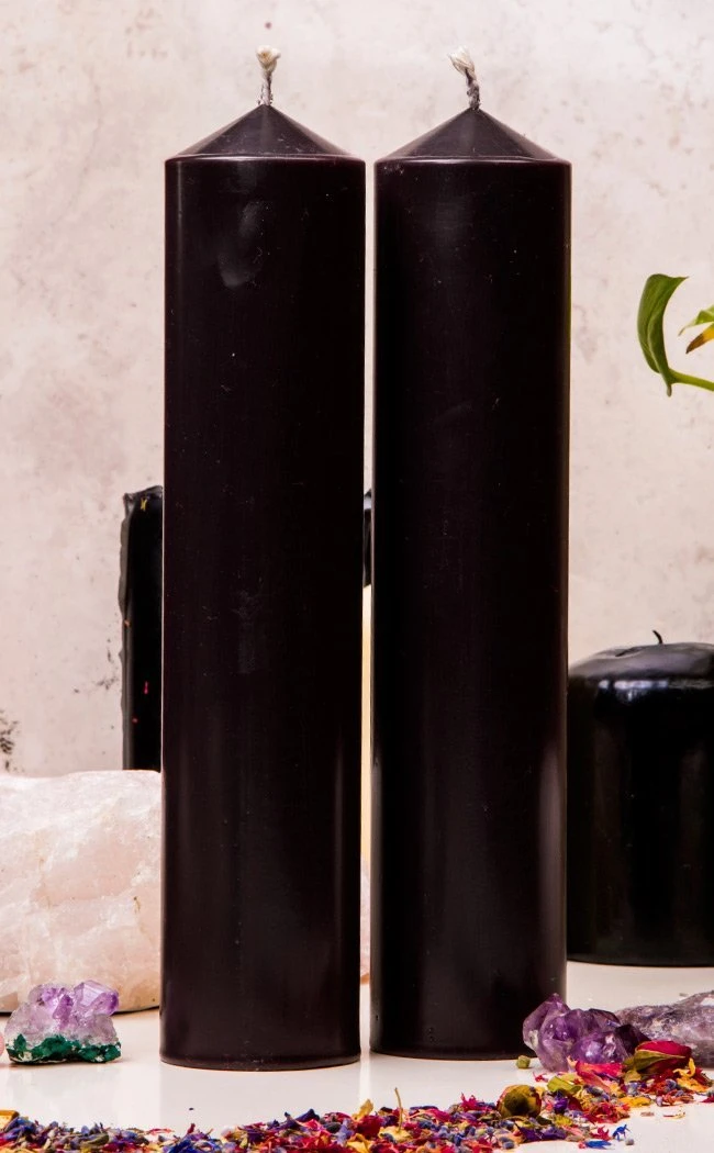 These black pillar candles measure 25cm x 5.4cm wide. Perfect for ritual, altar work or just ambiance. These are unscented so you can anoint with your own essences and oils. Try our various perfume oils here.Â