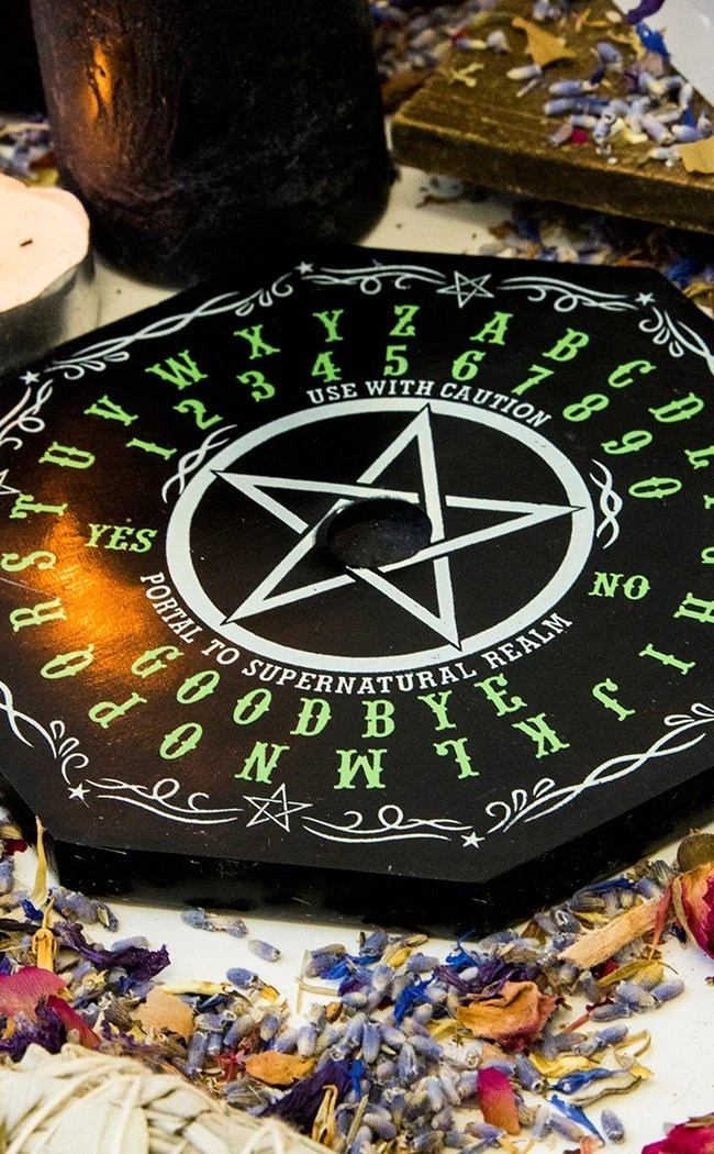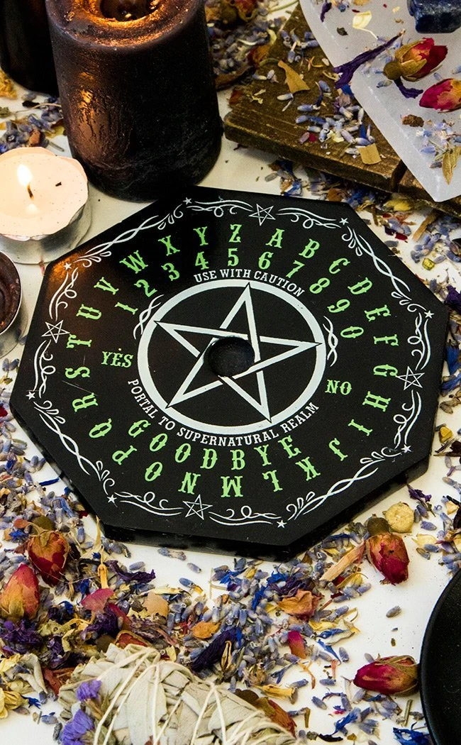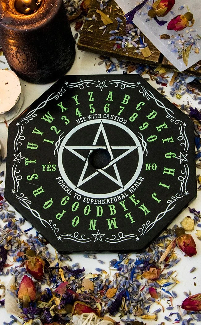 This holder is in the shape of an octagonal ouija board, made of hardy black soapstone and printed with a contrasting white and ghostly green motif.