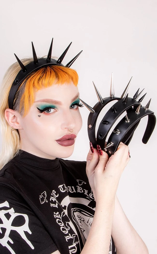 Get those flyaways and evil thoughts together with the Devil’s Spurs! Faux vegan leather is studded with sharp spikes of sleek black. Â