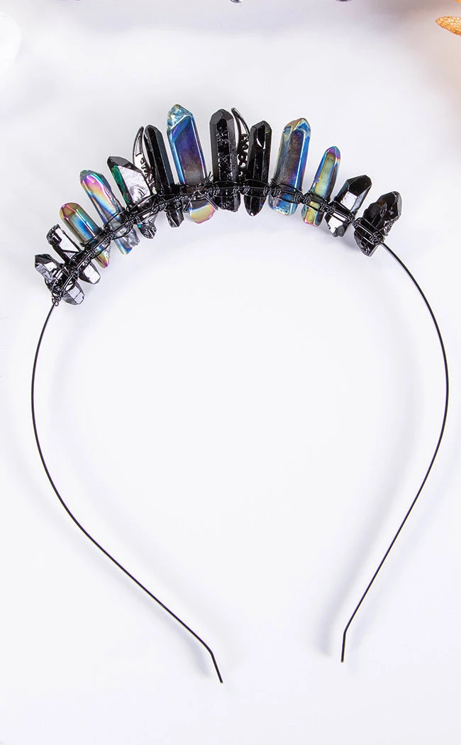 Crown yourself in crystal glory with the Fae Crown Aura Headband. Varying lengths of blacks and titanium aura crystals form a crown on a thin, black wire band, topped with an openwork crescent moon charm. The perfect finishing touch to magical hairstyles for every occasion!