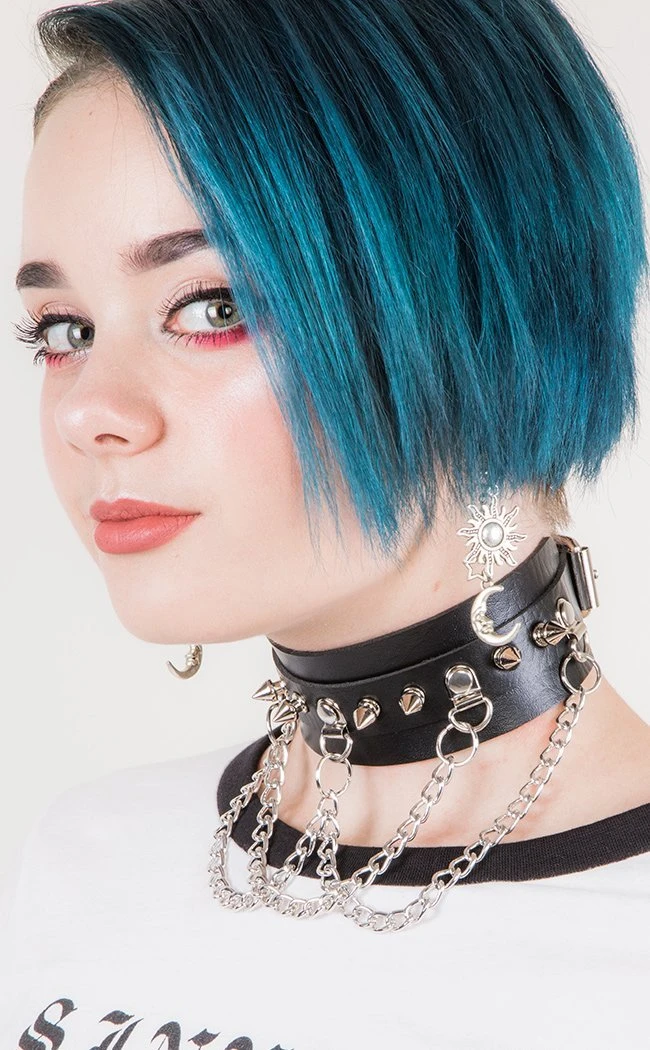 Protect yer neck with some heavy metal. Three overlapping chains drape down the neck, separated by square studs.Â