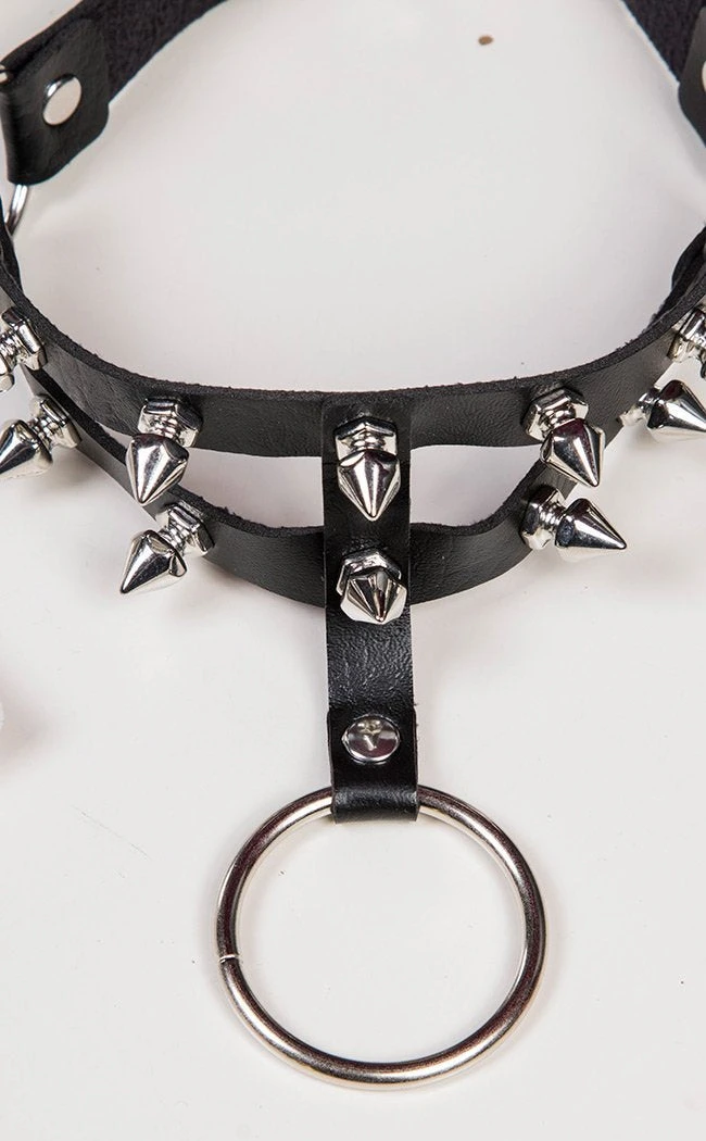 A darker twist on a classic black choker, this one features double black vegan leather bands with punk spikes and a convenient O ring in front 😉