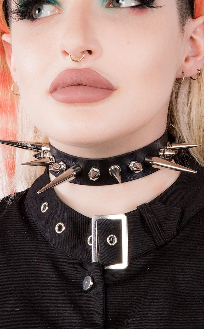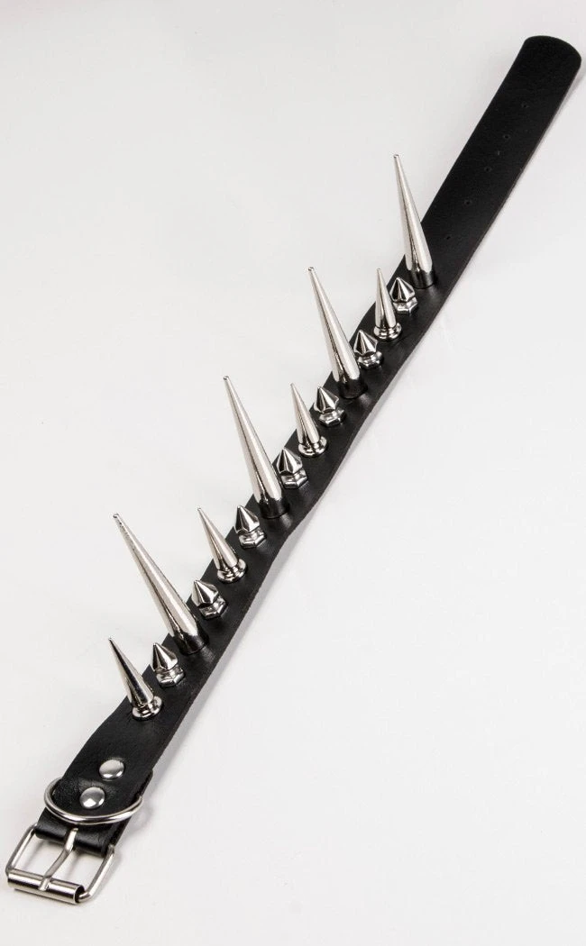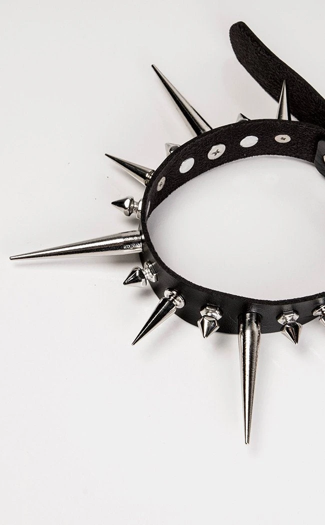 Get yer danger on with this demonic statement piece! Silver spikes of different lengths gash out from a vegan leather band, securing with an adjustable buckle.