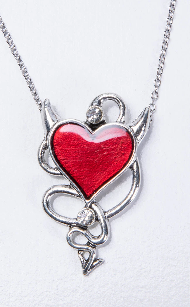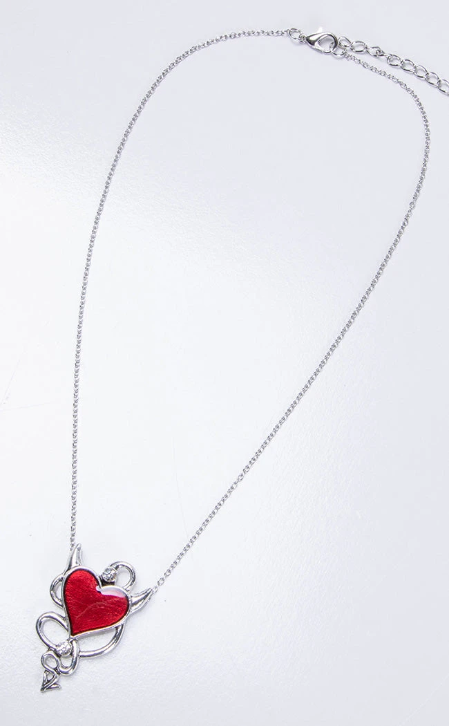 This naughty necklace features a devilish heart pendant with red enamel and clear gems along with a silver devil’s tail forming a point.