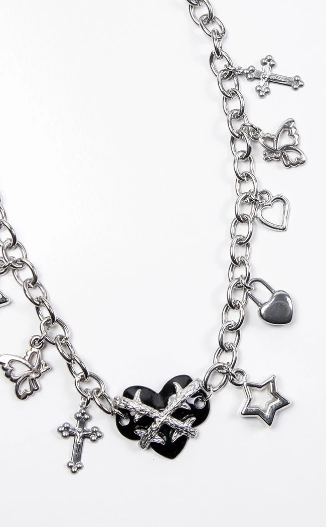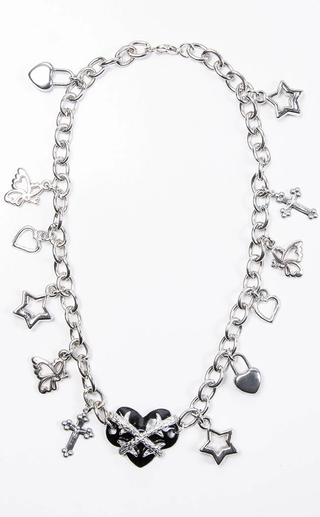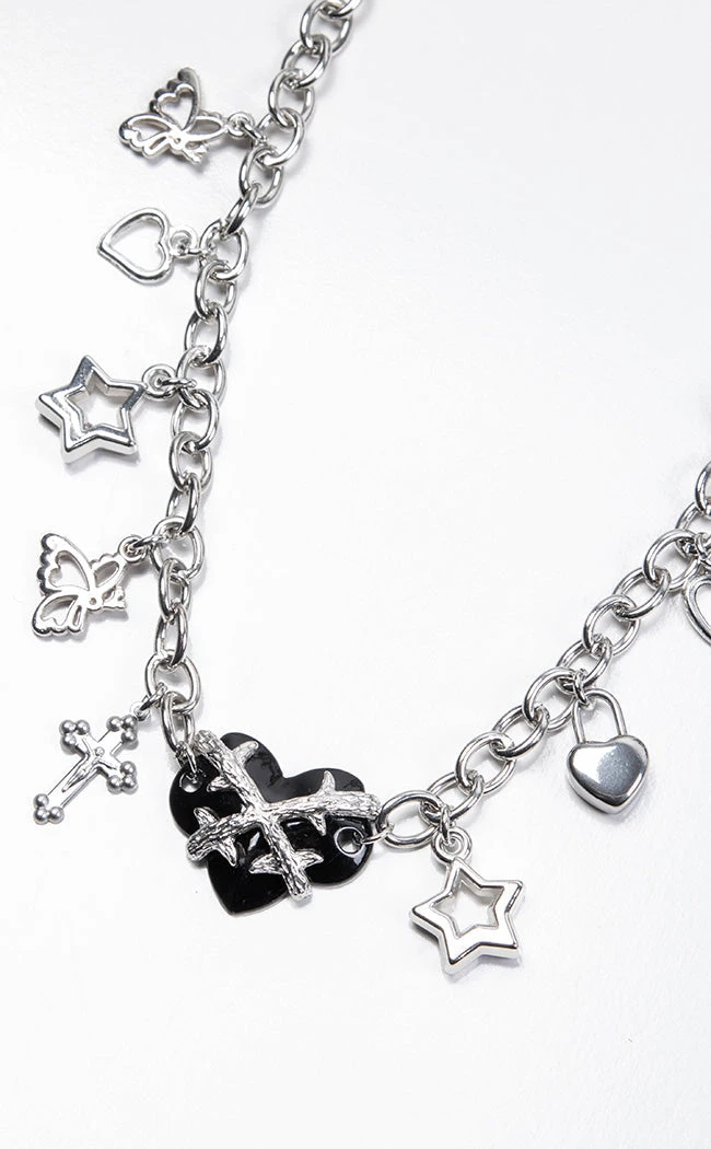 Cast a charm on your life with the Diva Necklace! This cute little choker features a thorny heart pendant on a chunky chain, surrounded by cute charms that’ll whisk you straight back to the year 2000.