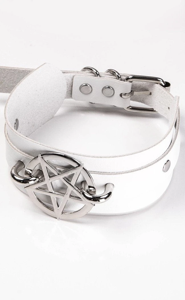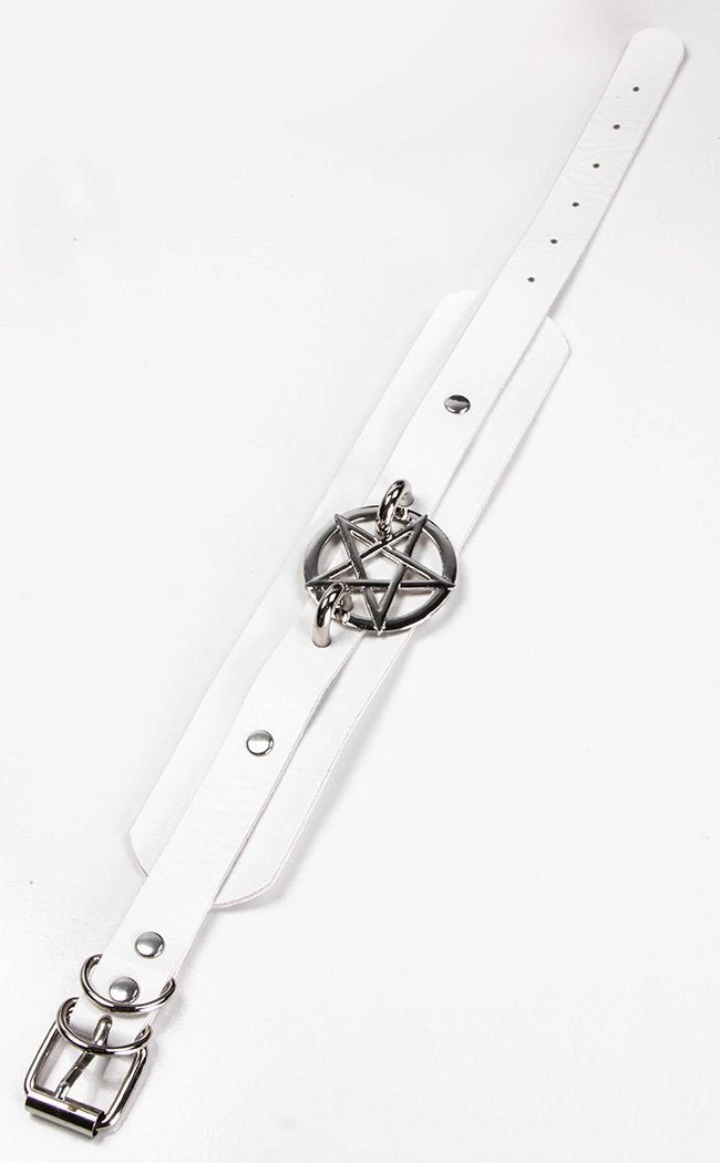 Get yer kicks in this chunky statement piece! This choker features a thick band of vegan leather topped with a thinner layer, decked out with fat studs and a chunky pentagram charm.
