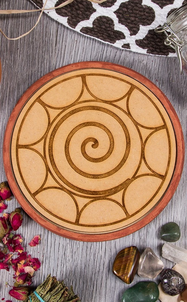 A beautiful wooden crystal grid pentacle and triquetra symbol base supplied alongside crystals for protection.Â