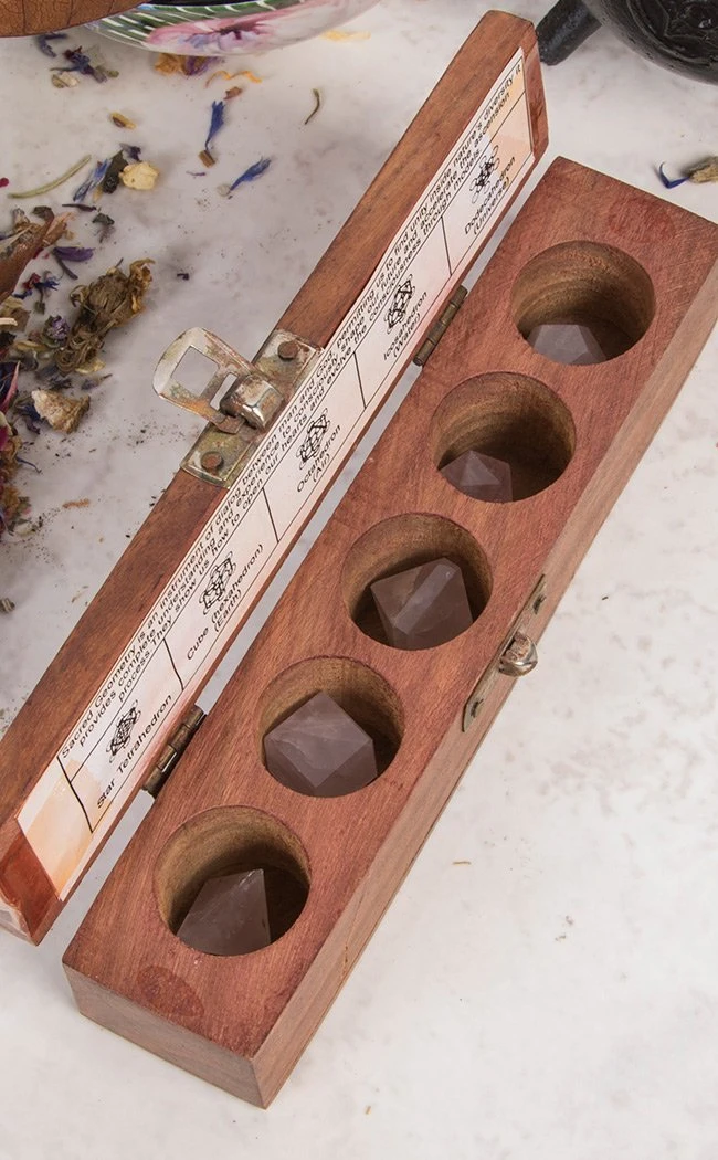 This set of 5 crystals are carved into prisms relating to the the elements water, earth, the universe and air as well as the star tetrahedron.
