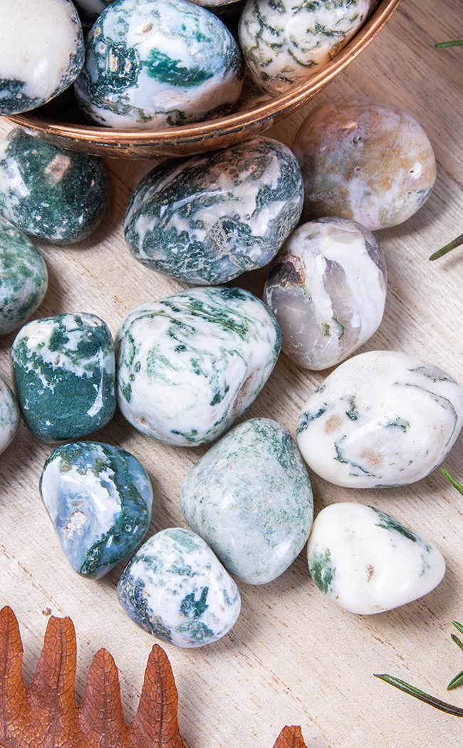 Tree agate is a beautiful mottled green stone, just like the light that shines through a forest canopy. Just like the forest, this stone instils in the user a sense of calm and tranquillity, allowing us to ground ourselves in nature, standing strong like the trunk of a towering tree. This makes it an ideal companion for deep meditation and relieving stress.