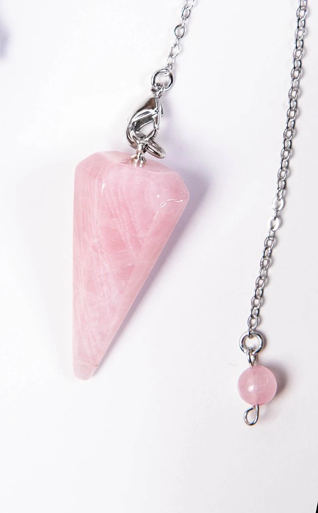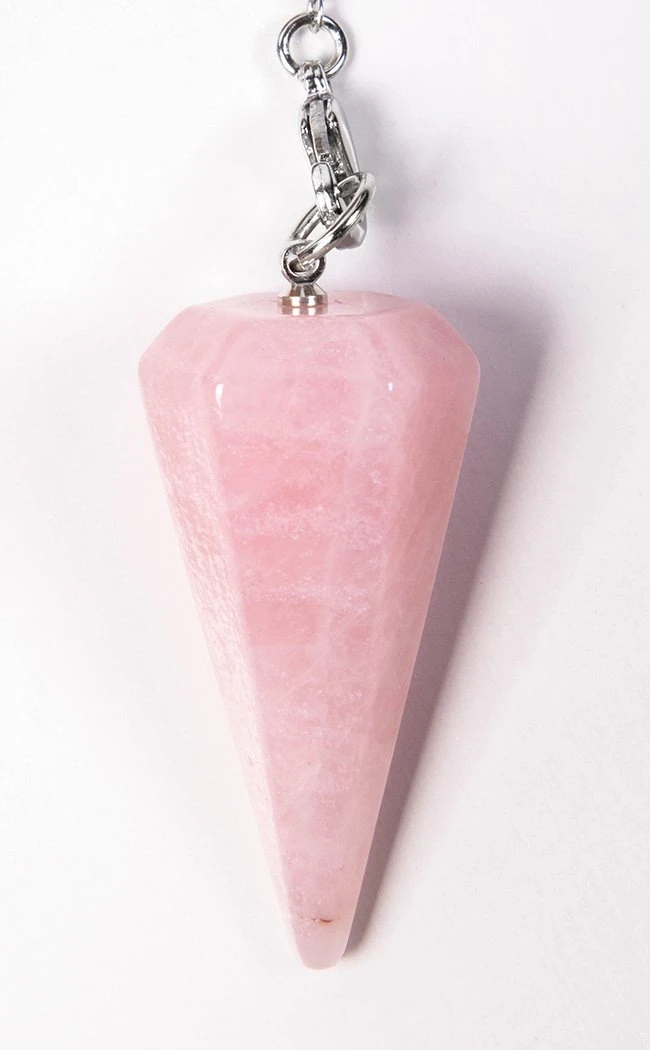 This pendulum features a faceted rose quartz crystal on a gorgeous silver chain.Â