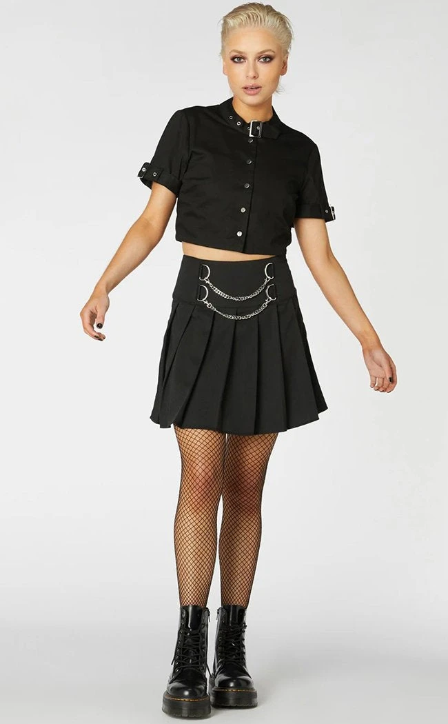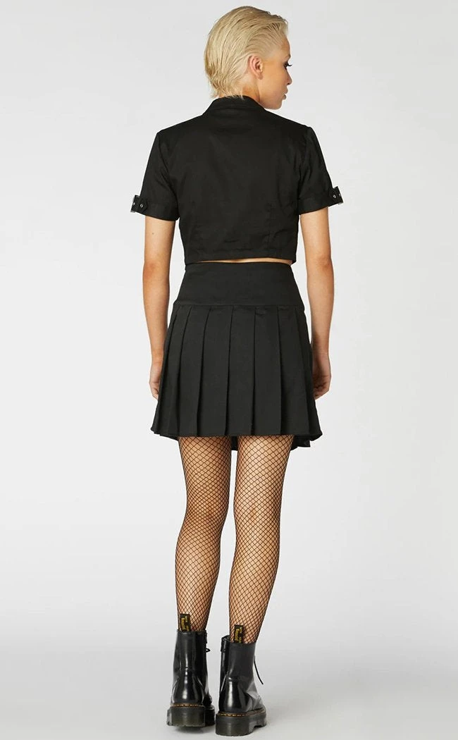 Punk meets corpgoth in this black-as-death blouse. The collar and sleeves are buckled, the front buttoning down and ending in a cropped length. The fabric is a rigid twill to withstand all the thrashing you’re gonna get up to.