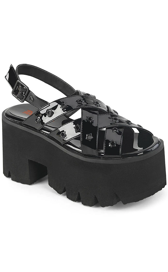 Create your own constellation! The ASHES-12 sandals are chunky black platform slingbacks featuring criss-cross straps studded with star-shaped eyelets. Super cute for yer summergoth wardrobe!