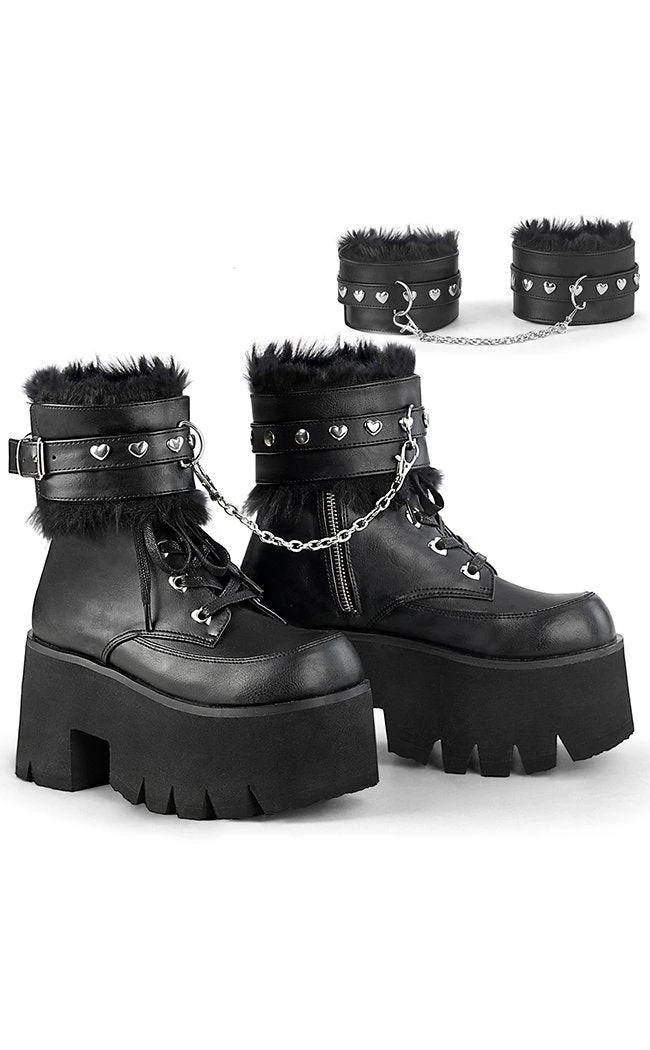 These are some changeable kinky boots! The boots themselves are chunky, versatile platforms but come with a bonus set of fluffy cuffs! Remove to wear on your wrists or keep on the boots for a lil visual kei flair, they match either way with heart studs galore!