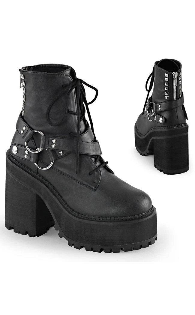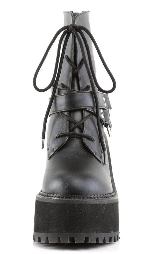 These rad gothic platform boots have a lace-up front with wrap-around snap straps and o-rings. The back has two rows of pyramid studs plus a zipper back for easy access. The perfect lil black boot.Â
