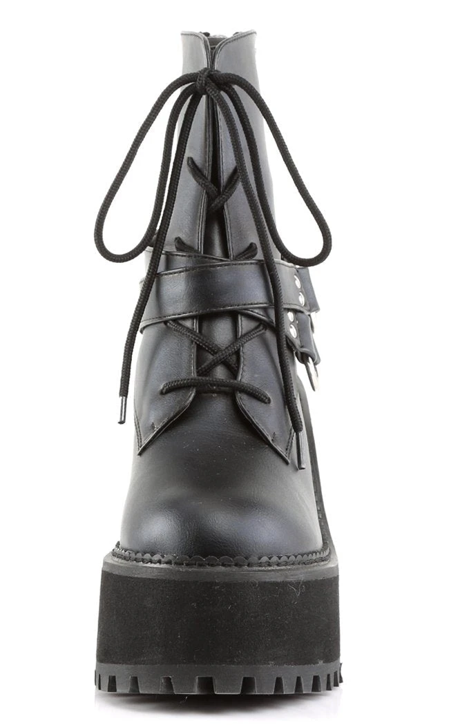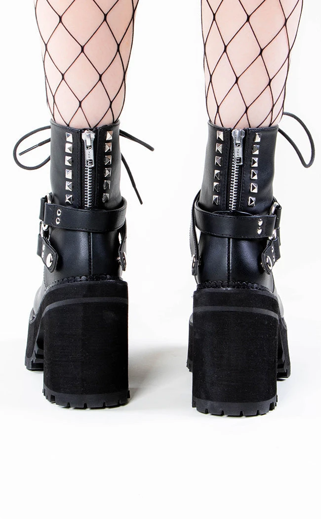 These rad gothic platform boots have a lace-up front with wrap-around snap straps and o-rings. The back has two rows of pyramid studs plus a zipper back for easy access. The perfect lil black boot.