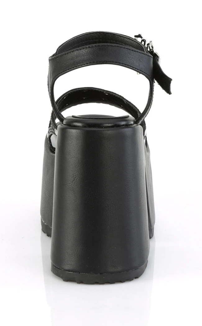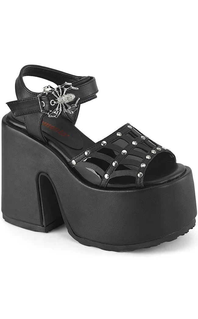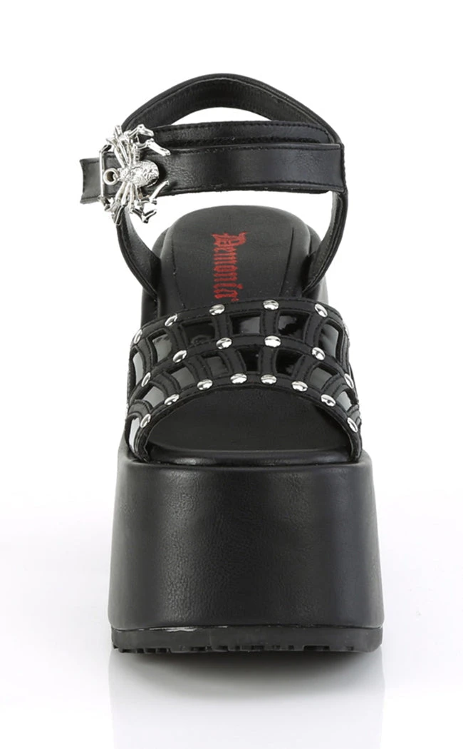 Spin a web in the CAMEL-17 platform sandals! These chunky cuties feature a patent spiderweb detail and studs on the vamp while the ankle strap secures with a spider buckle. An absolute must for summergoth styling!