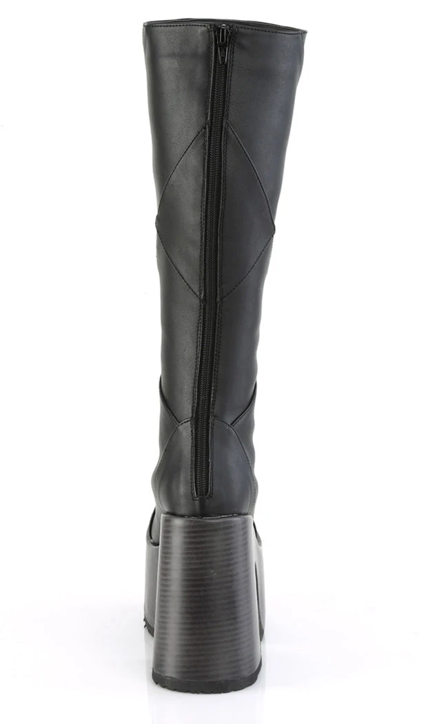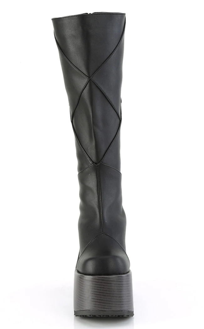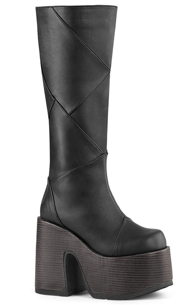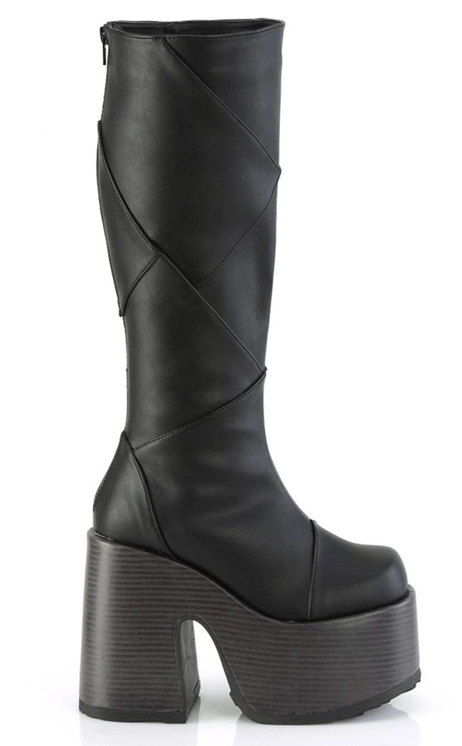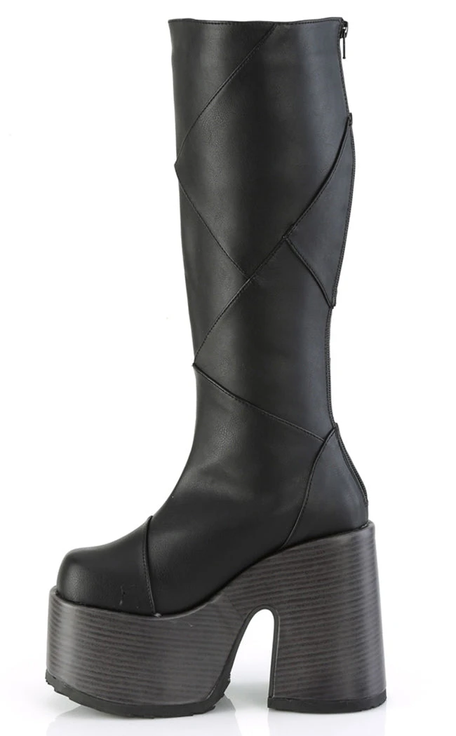 Get Franken-cute in the CAMEL-280 boots! These knee-high boots feature patchwork panels of faux leather on top of a faux wood wrapped platform. Make a statement and make it loud!