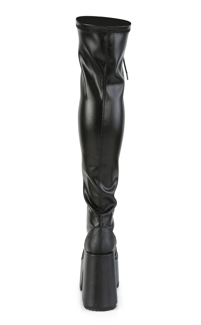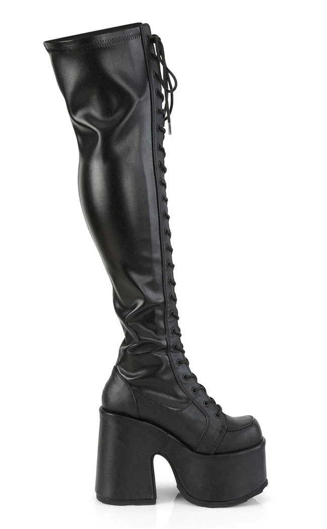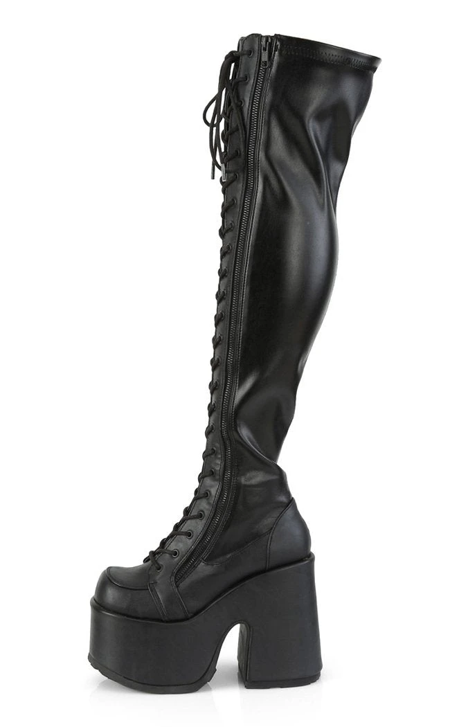 Awesome stretch thigh-high boots in matte black vegan leather with laces alllll the way up! Full-length zip for easy on and off.