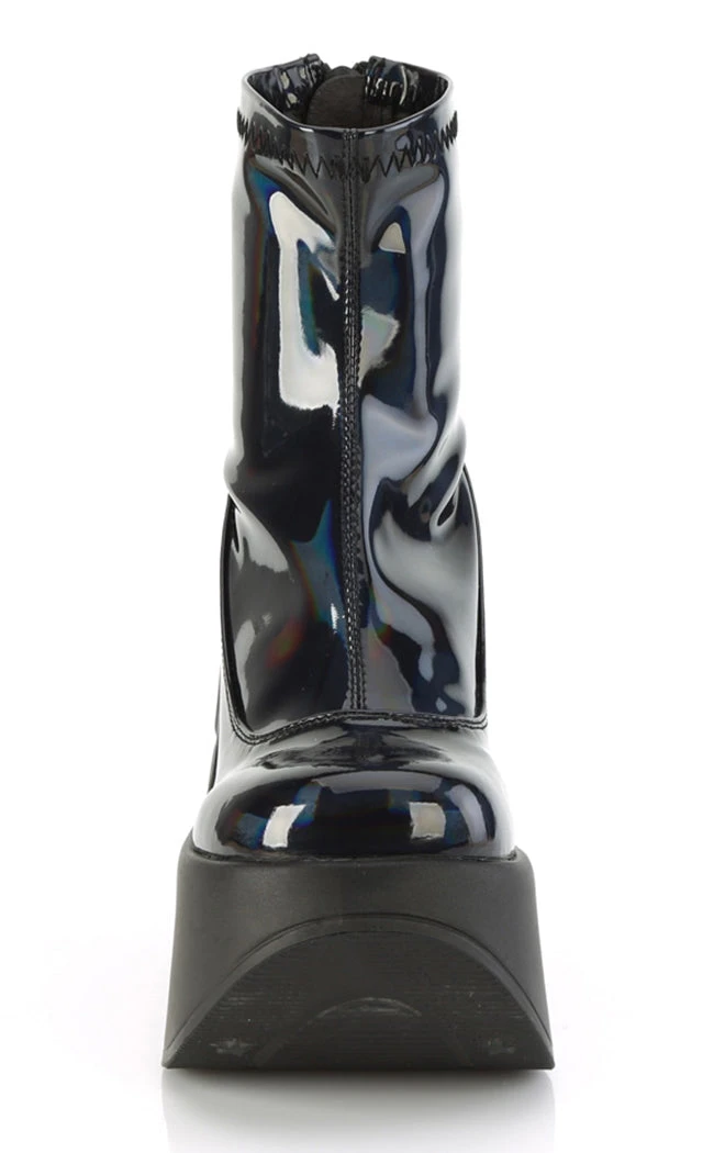Baby, you’re a star!  The DYNAMITE-100 boots are ankle-length wedge boots featuring stretch faux leather and a statement star cutout in the heel.