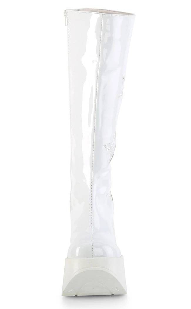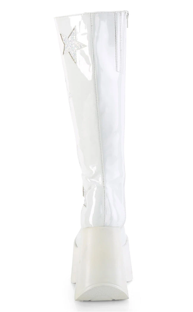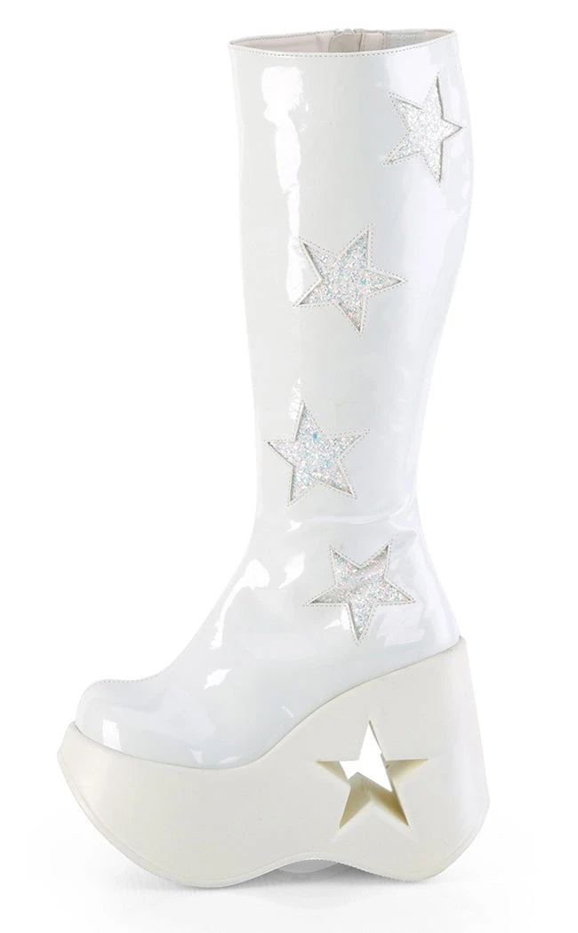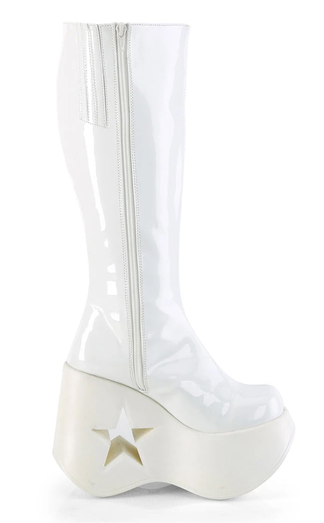 Baby, you’re a star!  The DYNAMITE-218 boots are knee-length boots with glittering star details to match the cutout in the wedge. The calf stretches and secures with a full-length inner zip.