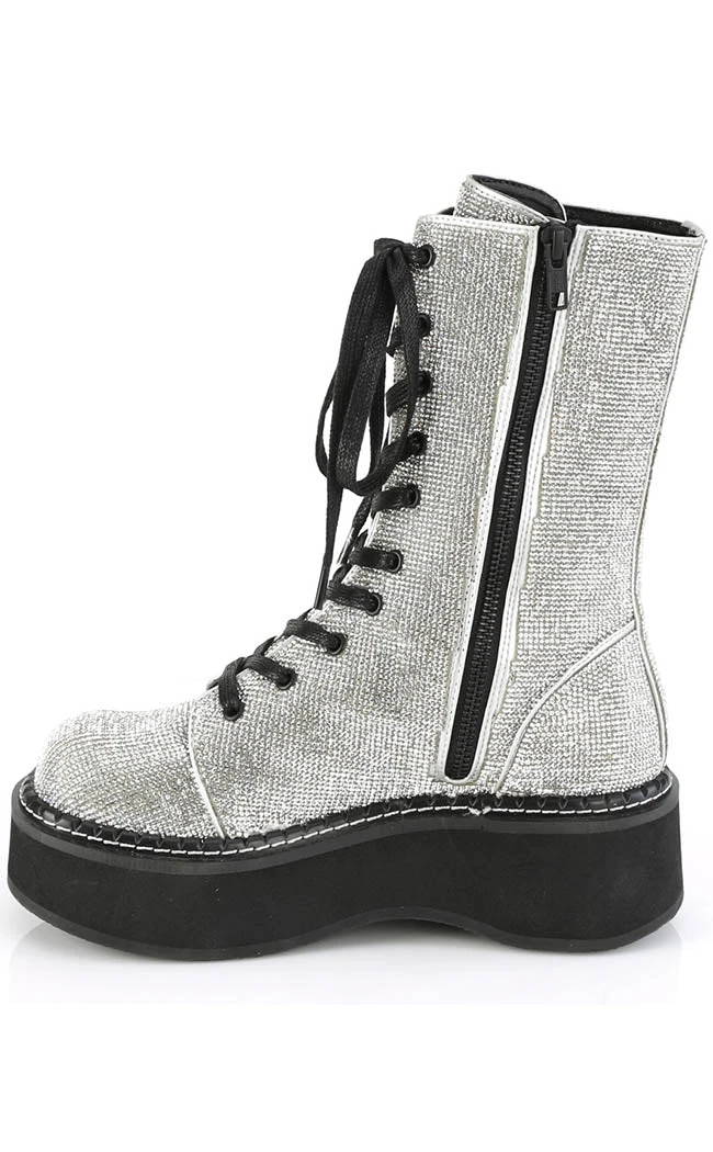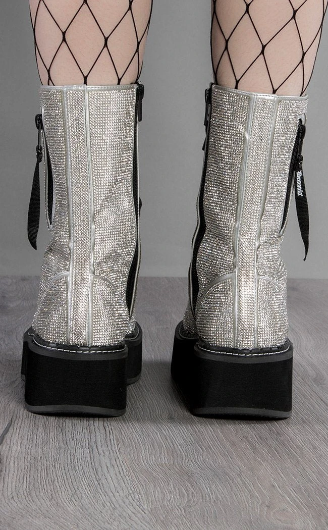 Here are a series of boots for true fans of the Chunk™. A thick platform to keep you comfy and tall as you stomp through the crowds. These babies are covered in silver, glittery rhinestones for that xxxtra flare!