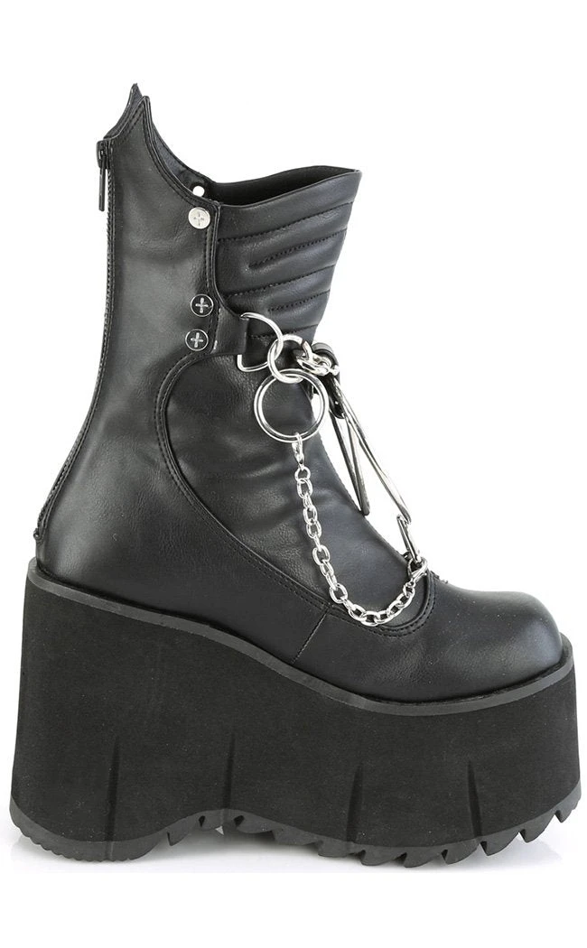 Get your futuristic stomp on with the KERA-130 boots! These impressive wedges feature a comfortable platform, wicked chains and an O ring feature as well as a pointed calf.