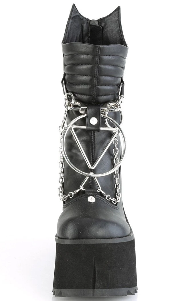 Get your futuristic stomp on with the KERA-130 boots! These impressive wedges feature a comfortable platform, wicked chains and an O ring feature as well as a pointed calf.