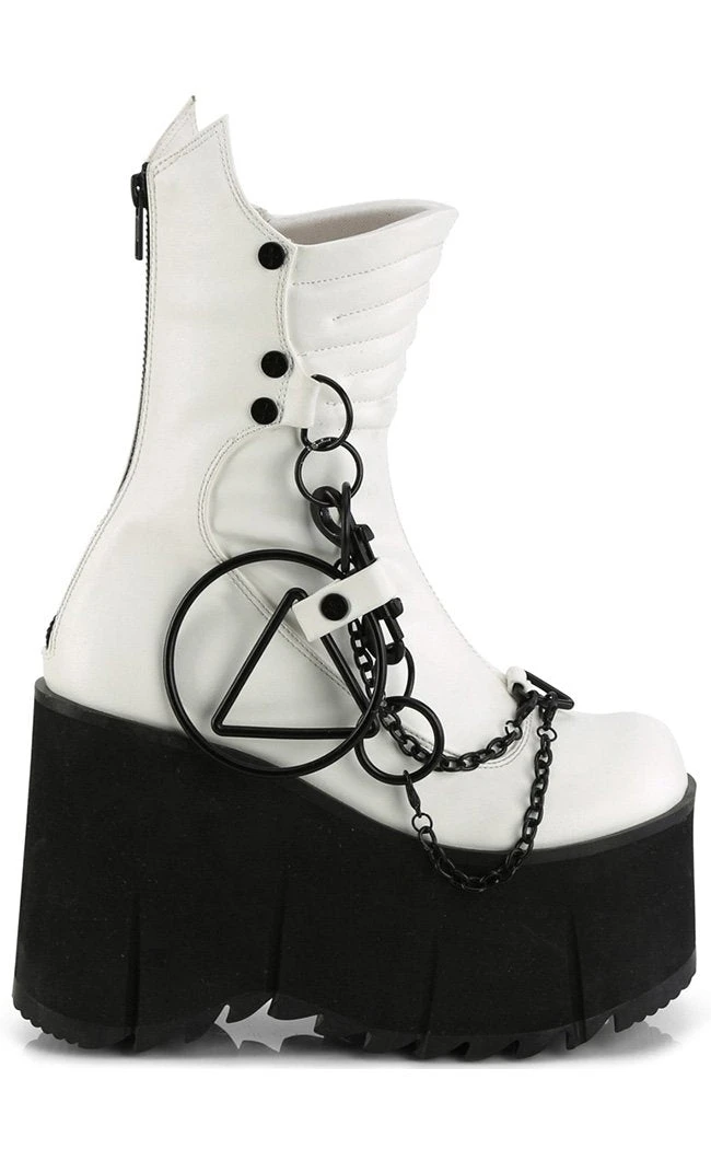 Get your futuristic stomp on with the KERA-130 boots! These impressive wedges feature a comfortable platform, wicked chains and an O ring feature as well as a pointed calf.