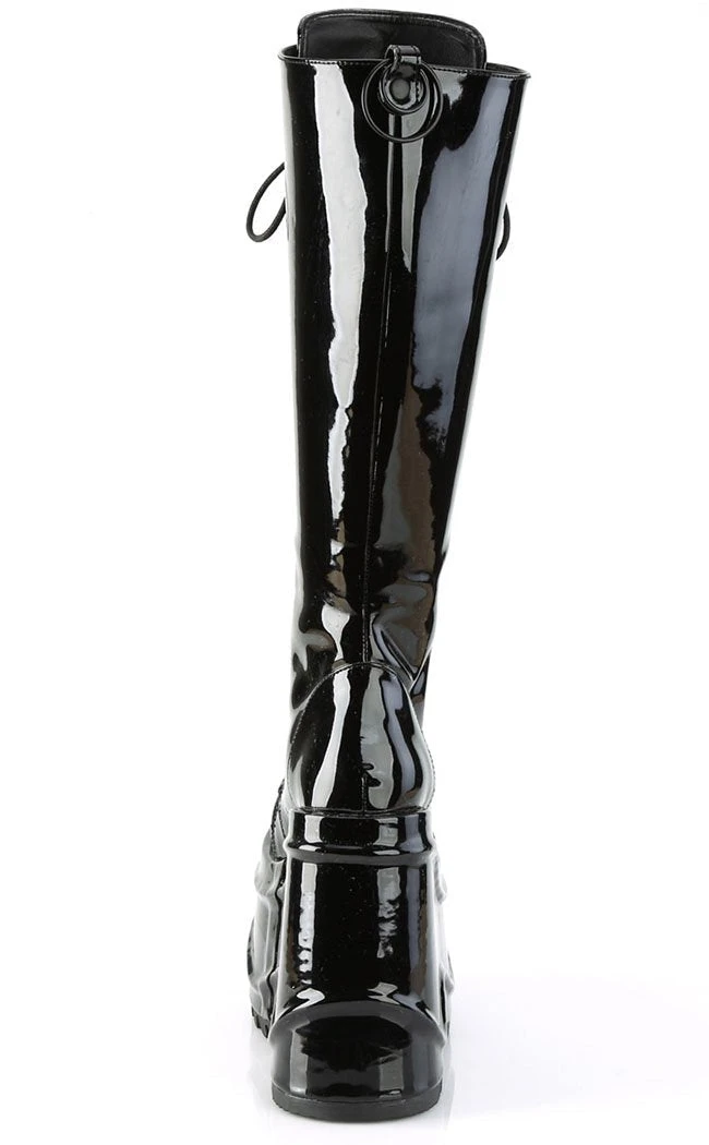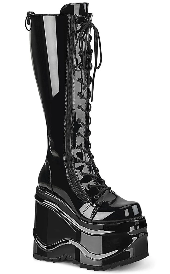 Don’t just make waves, generate tsunamis! You’ll quake the earth stomping around in these gigantic 6 inch wedges. These boots lace up to the knee but the double zips alongside the lacing let you slip ’em on and off with ease.