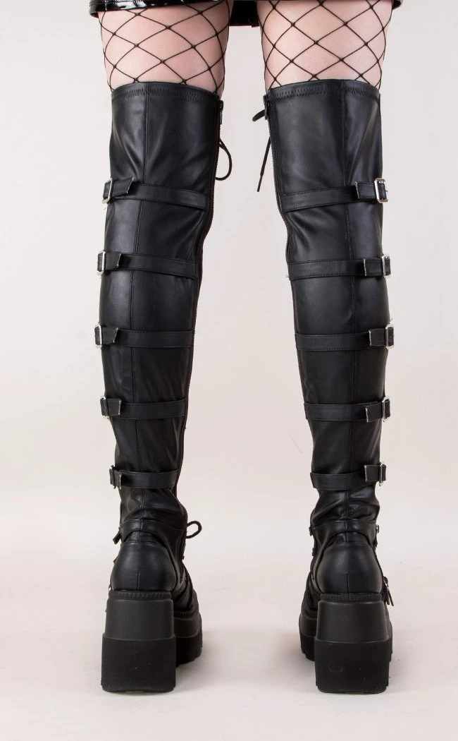 All the way up, baby! These tiered wedge heels are a cute variation on Demonia’s other wedge collections. This boot goes thigh high and has tons of straps and buckles but a side zip for easy access 😉